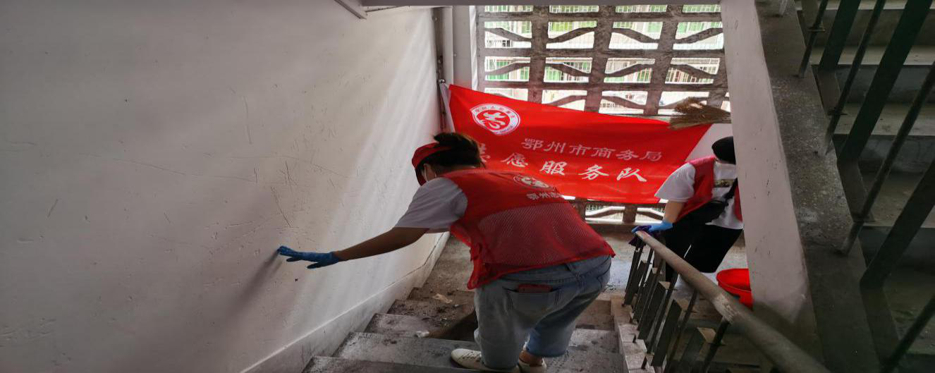 在和贵园社区工作人员组织安排下,我局志愿者们自带水桶、抹布、扫把等清洁工具,分成两人一组,一个在前面扫地,一个在后面擦拭扶手栏杆,对八一小区和和尚桥三栋共14个单元逐层进行清理打扫。志愿者们在烈日高温下衣服渐渐汗湿、微微喘着气,但还是坚持打扫完每一栋楼层,对灭火器和提示牌也不放过。在志愿者们的努力下,八一小区和和尚桥三栋楼道卫生有了明显的改善。