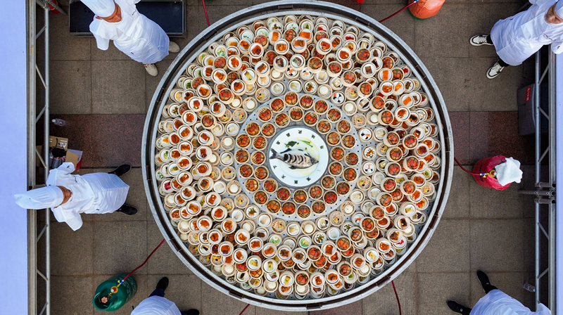 “出笼咯!出笼咯!”在众人合围的大蒸笼旁,众大厨合力做出精品佳肴,一阵风刮过,让市民游客直呼“鲜掉眉毛”。