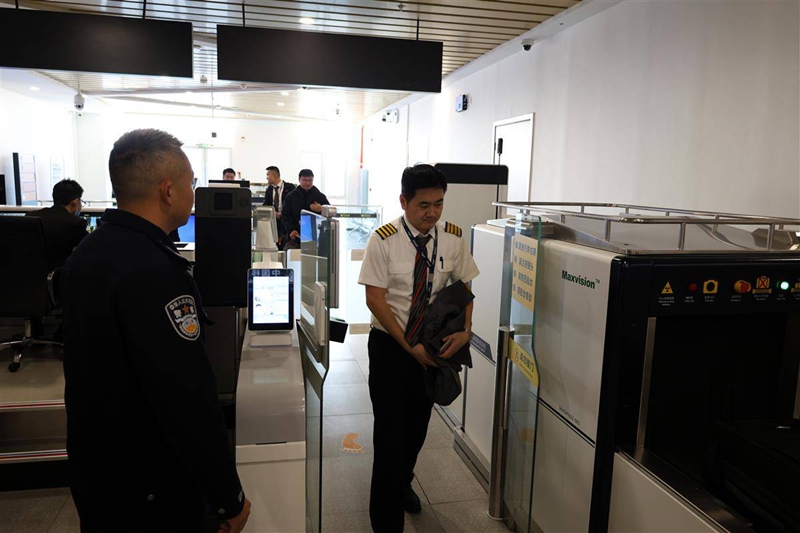 全国首创!鄂州花湖国际机场“三检合一”联合查验通道启用。飞行员张凯成为首位体验者。湖北日报全媒记者周鹏摄