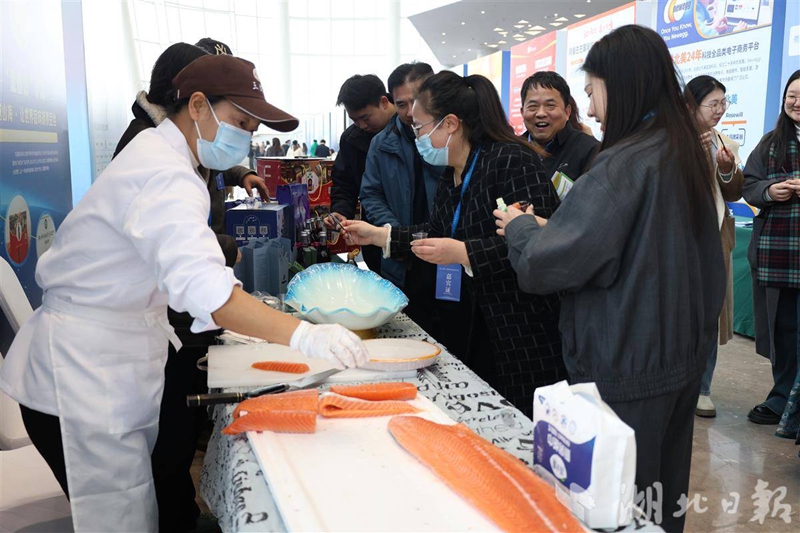 湖北(鄂州)跨境电商招商选品对接会现场,大家品尝挪威三文鱼。
