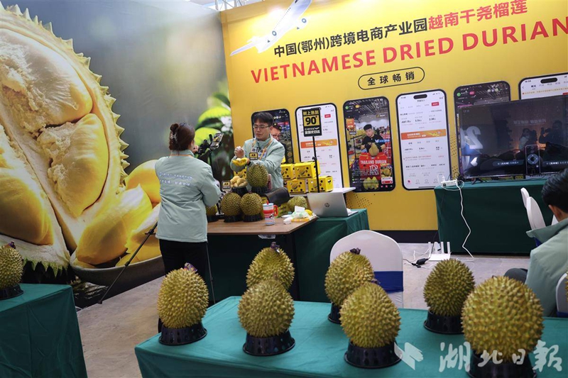 湖北(鄂州)跨境电商招商选品对接会现场,主播直播销售越南榴莲。