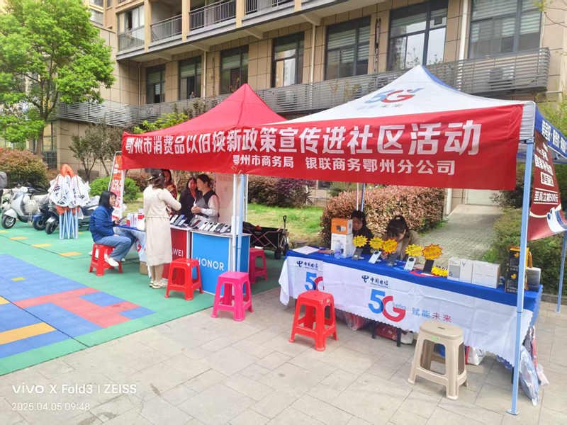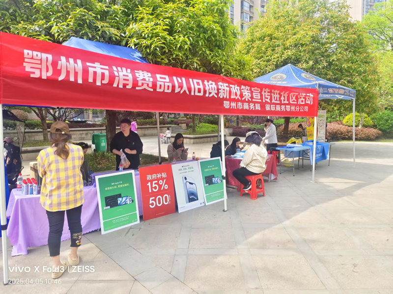 4月5日至6日,鄂州市 “消费品以旧换新进社区” 系列活动火热开启。在恒大、融创、竹林广场、驰恒、荣府、吴都阳光等13个人流密集的小区,鄂州市商务局携手银联商务鄂州分公司,组织60余家商户带着海量优惠资源深入基层,通过“政策解读+场景体验” 模式,为市民精心打造了一场家门口的消费盛宴。
