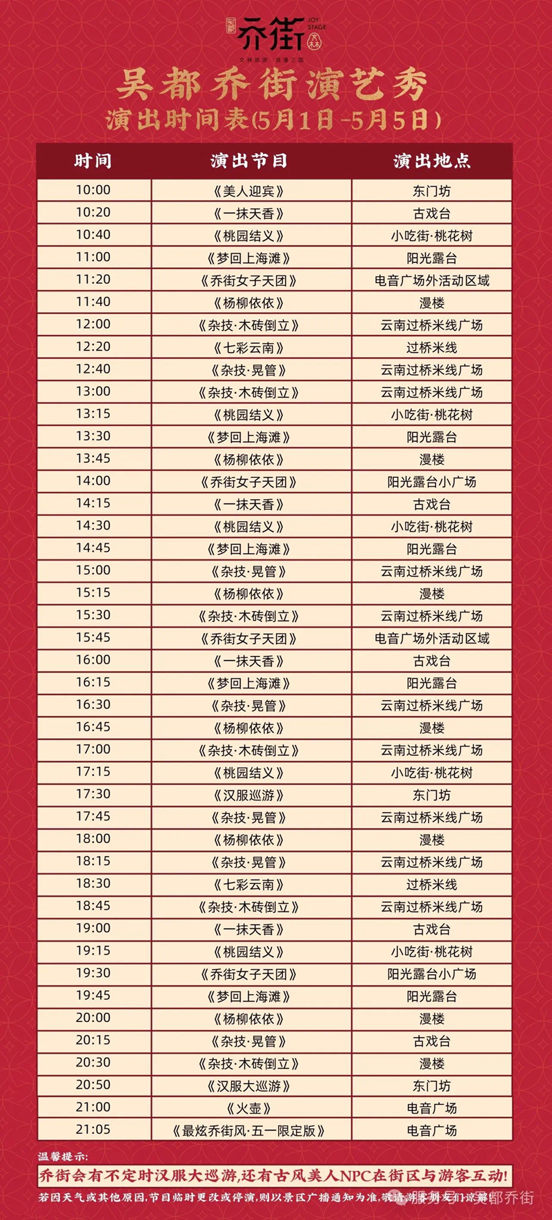 吴都·乔街:五一劳动节期间推出“市井三国”沉浸式活动、非遗戏曲、潮酷的女团表演以及酷炫的电音蹦迪等演艺产品,游客可参与汉服巡游、诗词诵读等。