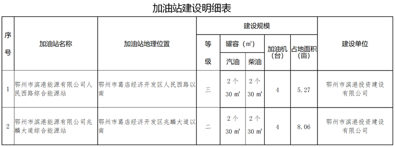 1.新建鄂州市滨港能源有限公司人民西路综合能源站。建站地址:鄂州市葛店经济开发区人民西路以南,建站等级为三级。