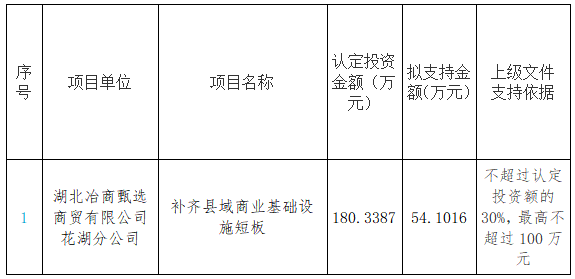 根据《省商务厅 省财政厅 省乡村振兴局关于支持实施县域商业建设行动的通知》(鄂商务发〔2022〕45号)和《鄂州市县域商业体系建设实施方案》(鄂州商务文〔2023〕5号)文件精神,经企业申报、鄂城区商务局推荐,第三方评审、审计和现场核查等环节,市商务局拟对我市县域商业建设行动专项资金支持项目(见附件)予以公示。公示期为2025年12月11日至12月17日(7天)。按相关规定,纳入支持项目必须客观真实,且没有享受过其他财政类资金支持。如有异议,请在公示期内向市商务局反映,逾期视为无异议。