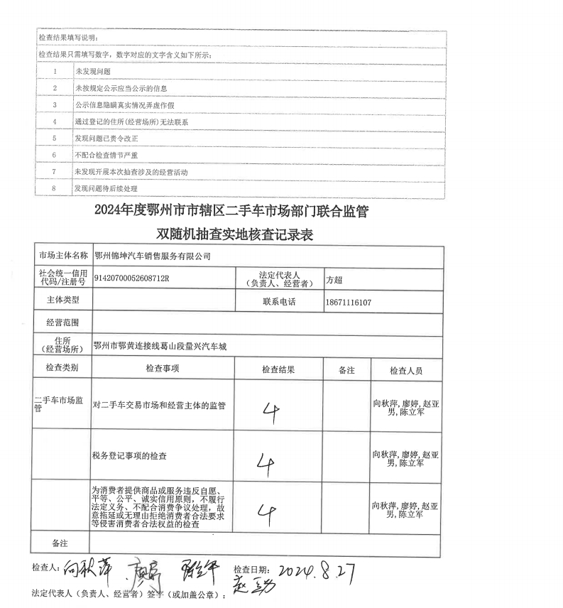 【双随机、一公开检查结果】2024年度鄂州市市辖区二手车市场部门联合监管双随机抽查实地核查记录表——鄂州锦坤汽车销售服务有限公司